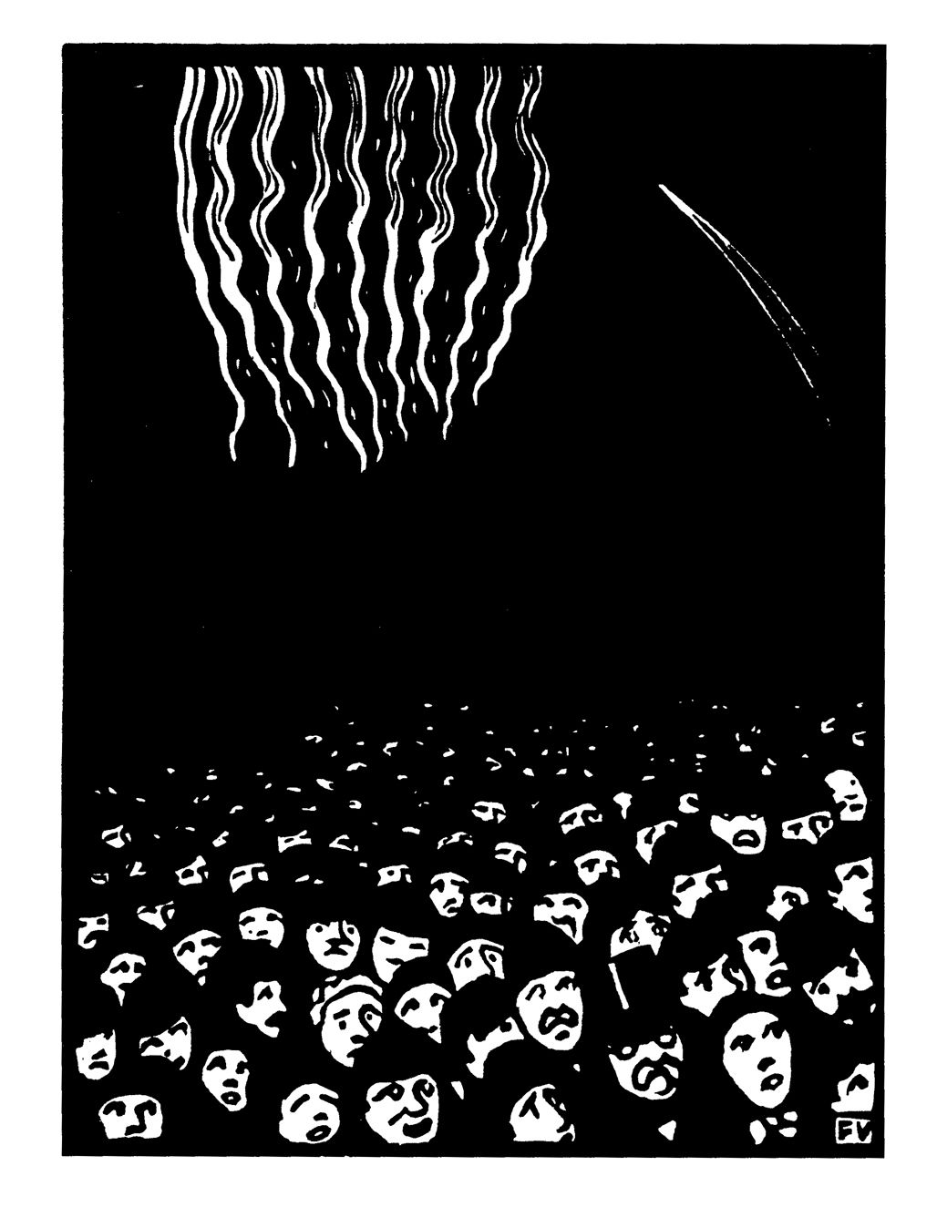 La critique considère les bois gravés de Félix Vallotton (1865-1925), dont on célèbrera en décembre le centenaire de la mort, comme le sommet de son art. Vallotton excelle comme son ami et confrère Alfred Jarry dans la peinture des masses subjuguées par la bourgeoisie industrielle de la fin du XIXe siècle – ici par un « Feu d’artifice ». On verra par suite au XXe siècle qu’il n’y a pas de populisme, sans que le peuple n’ait été auparavant réduit à une masse informe, tantôt passive, tantôt déferlant avec violence et rompant les digues par lesquelles on croyait pouvoir la contenir.