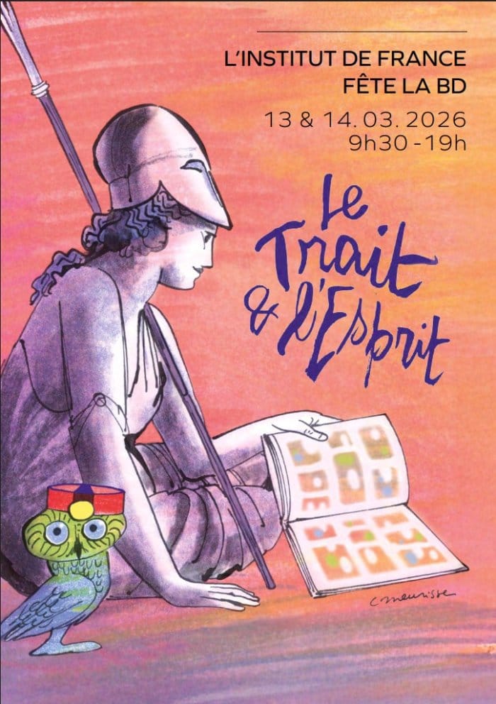 Etonnante affiche de l’Institut de France représentant Athéna pour la promotion de journées dédiées à la BD début mars.