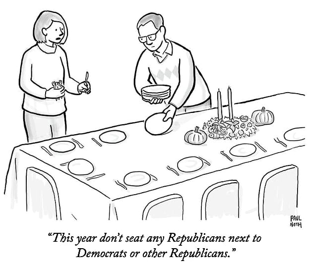 “Cette année évite de placer un Républicain à côté d’un Démocrate ou d’un autre Républicain.” (par Paul Noth).